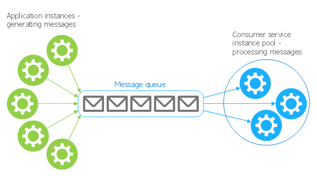 The green circles are different apps that need something from the blue circles. If every green circle sent a message at the same time the blue system would get overwhelmed. The job of the message queue is to take in all of the green requests and hand them off at a pace the blue circles can handle. This usually happens very quickly, and from the perspective of the green circles, it allows a message to be transferred at anytime without having a threat of overwhelming the blue system.