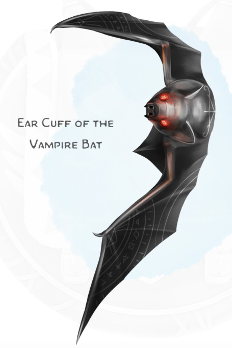 While wearing this dark ceramic ear cuff, your Wisdom (Perception) checks that rely on hearing are made with advantage. In addition, whenever you make a Wisdom (Perception) check that involves hearing, you can choose to command the ear cuff to momentarily enhance your senses. When you do, its eyes flash with a piercing red glow as the bat’s ceramic fangs bite down on your ear. You take 1d4+1 necrotic damage from its bite, and immediately gain a bonus to your Wisdom (Perception) check equal to the amount of necrotic damage taken in this way. This damage ignores any resistance or immunity to necrotic damage. You can decide to use this ability after you roll the d20, but before the DM determines the outcome.