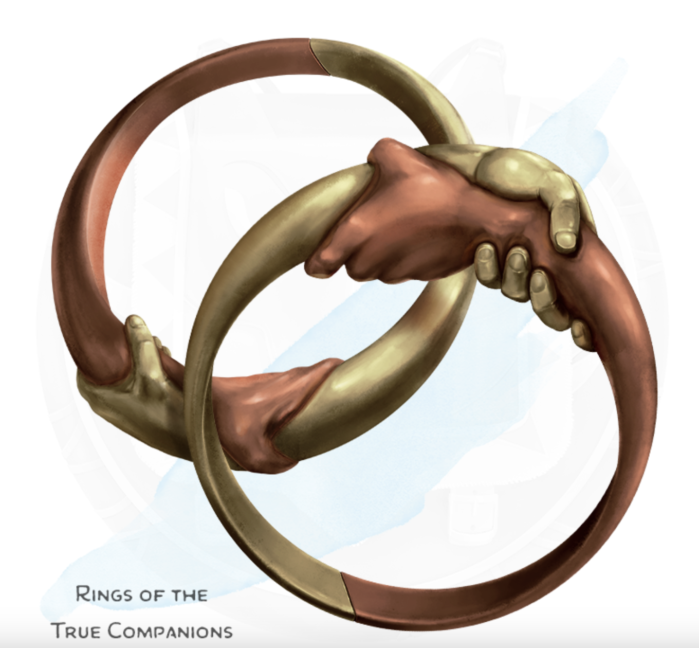 These rings typically come in pairs but have been known to come in sets of up to four. Each ring is magically connected and can be attuned to by a different creature. While wearing one of the rings, you can use the following property even if you aren’t attuned to it: When another creature that you can see who is also wearing one of the rings drops to 0 hit points, you can use your reaction to cause that creature to drop to 1 hit point instead. Once this property of the rings has been used, it can’t be used again until the next dawn. If you find an additional ring of the true companions, you can add it to an existing set by holding all of the rings together for 1 minute. A ring can only be a part of one set at a time, and is removed from a set if it’s more than 1 mile away from the other rings for 24 consecutive hours. If you are the only creature attuned to one of the rings, it gains 3 charges and regains 1d3 expended charges daily at dawn. While wearing the ring, you can use an action expend 1 of its charges to cast the cure wounds spell (spellcasting modifier +3). If the target of the spell is another creature wearing one of the rings, the spell’s range increases to 30 feet. If additional creatures are attuned to rings from the set, the rings’ collective strength grows and they share a pool of charges instead. For each attuned creature after the first, the rings gain an extra 2 charges and regain another 2 expended charges daily at dawn. The rings can share a maximum of 9 charges in this way (1d3 + 6). The following properties are shared among all attuned creatures who are also wearing one of the rings from the set. The effects are cumulative and are determined by the number of attuned wearers: 2 attuned wearers: When you use the rings to cast cure wounds on another wearer, you can choose to cast it using a bonus action instead, but can only cast it once on the same turn. 3 attuned wearers: When you use the rings to cast cure wounds on another wearer, its range increases to 60 feet, and you can increase the spell slot level by one for each additional charge you expend, up to 4th level. 4 or more attuned wearers: When you use the rings to cast cure wounds on another wearer, you also gain 1d4 + 1 temporary hit points for each charge you spend.